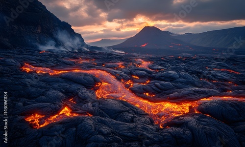 Fototapeta premium The lava flows down the valley, creating an endless stream of glowing red...