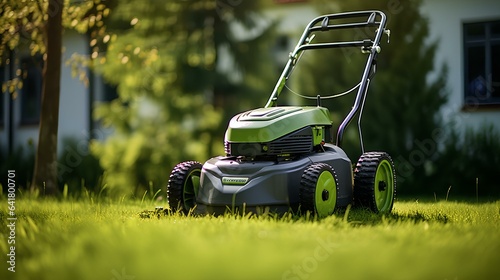 Fototapeta premium The lawn mower is on the lawn at the house.