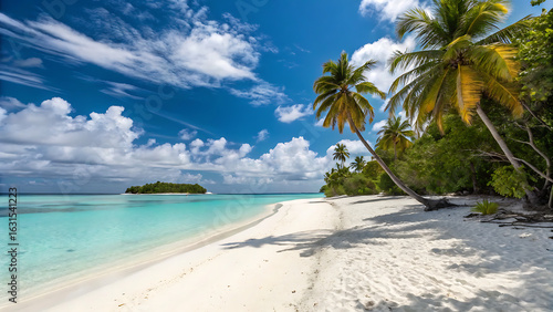 Obraz premium The layout features a wide expanse of white sandy beach stretching across the foreground, meeting the clear turquoise waters of the ocean on the left.