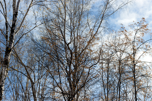 Fototapeta premium the leaves of the trees leafless with leaves on sky background