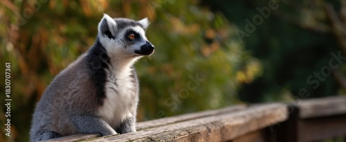 © ckybe, Naklejka premium The lemur soaks in the comforting warmth of sunlight on the wooden platform