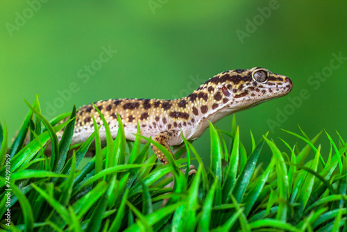 © lessysebastian, Naklejka premium The leopard gecko or common leopard gecko (Eublepharis macularius) is a ground-dwelling lizard native to the rocky dry grassland and desert regions