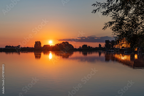 Fototapeta premium The light of the rising sun above lake Noordhovense plas is beautifully reflected in both the water and the windows of the adjacent houses