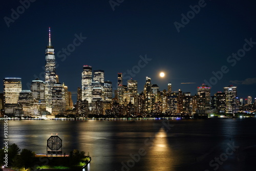Obraz premium The lights of Manhattan skyscrapers on a moonlit night.