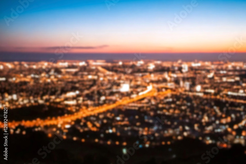 © ATRPhoto, Obraz premium The lights of the night city. Blurred background. Lanterns on the street. big city lights in the twilight evening with blurring. Colorful circles of light abstract. circular bokeh on blue horizon.
