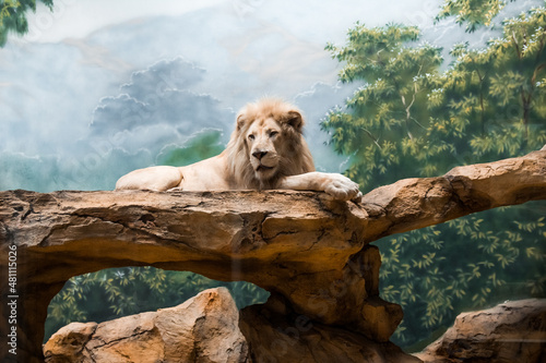 © Sarbinaz Mustafina, Naklejka premium The lion sits on a stone, against the background of the sky. King of beasts