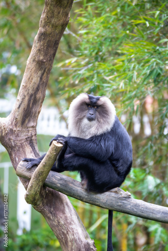 Obraz premium The lion-tailed macaque sitting on a branch of a tree.