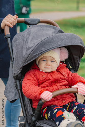 © combo1982, Obraz premium The little baby is sitting in the pram.