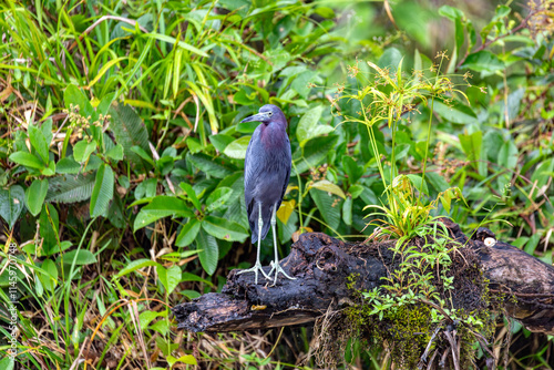 Naklejka premium The little blue heron (Egretta caerulea), small heron of the genus Egretta, Refugio de Vida Silvestre Cano Negro, Wildlife and bird watching in Costa Rica.