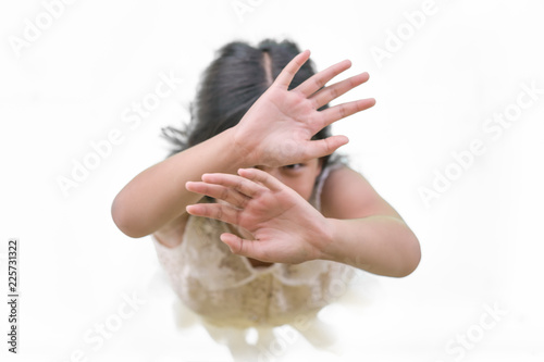 Fototapeta premium The little girl looked up at the sky and raised her hand for help.