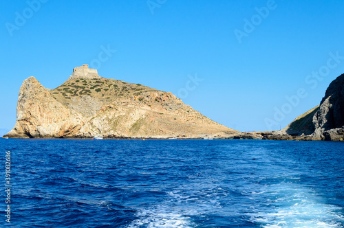© eugpng, Fototapeta premium The little island of Marettimo in Sicily seen from a boat. Here the detail of "Punta Troia" and its old castle