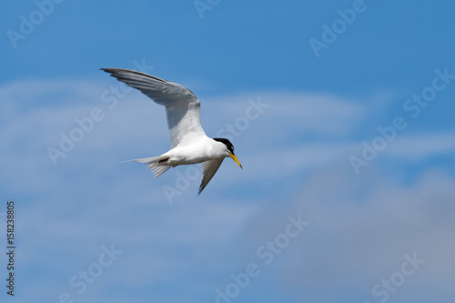 © Tanased, Fototapeta premium The little tern flew freely in the blue sky surrounded by white clouds.