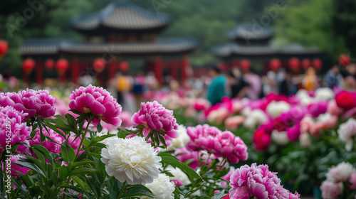 © mohammad, Obraz premium The lively Luoyang Peony Festival with a garden full of pink, white and purple peonies in full bloom, visitors wearing traditional Chinese clothes walking among the flowers, Ai generated images