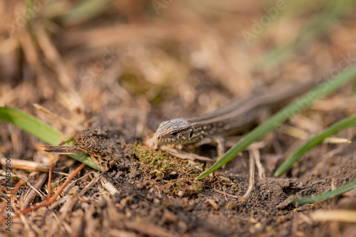 Fototapeta premium The lizard runs on the ground. Reptile animal. Fauna. Selective focus. Macro.