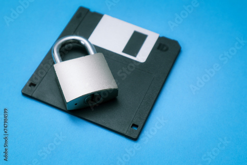 Fototapeta premium The lock is on the black retro 3.5" floppy diskette. Cyber security and data...