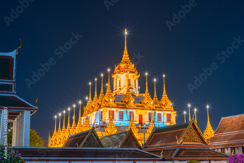 Naklejka premium The Loha Prasat, Wat Ratchanatdaram Worawihan at night that is turning on a...