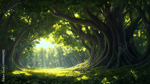 Naklejka premium The long, curved branches of a mature banyan tree have formed a natural canopy that filters the sunlight, jungle shelter, arboreal sanctuary, verdant canopy. Arboreal. Illustration