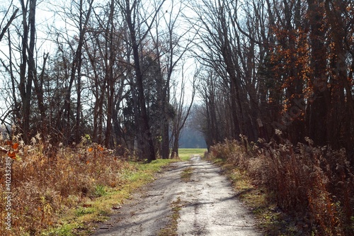 © Al, Obraz premium The long empty sidewalk in the autumn park.
