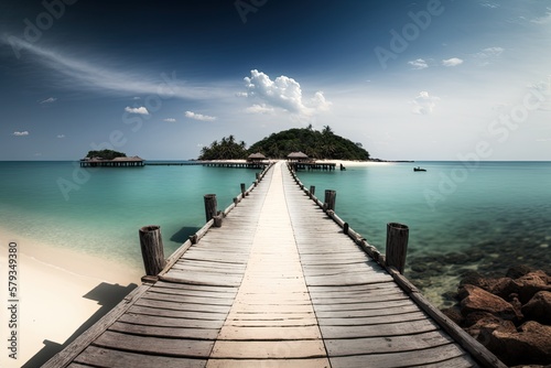 © The 2R Artificiality, Obraz premium The long, straight wooden pier on Koh Kham Island, with its stunning backdrop of blue ocean and a white sand beach, is a true picture perfect scene. Take a peek at Trat, Thailand's Koh Mak Island. Lig