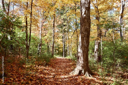 © Al, Fototapeta premium The long trail in the autumn forest on a sunny day.