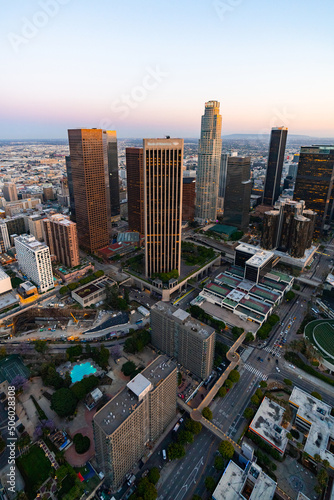 © sleg21, Obraz premium The Los Angeles financial district after the sunset