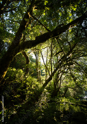© Thorin Wolfheart, Fototapeta premium The lush forest of the PNW The golden sunlight beams trough the green the forest welcomes the early morning sunlight of the summer sun. A magical scene of natural beauty in the Pacific Northwest