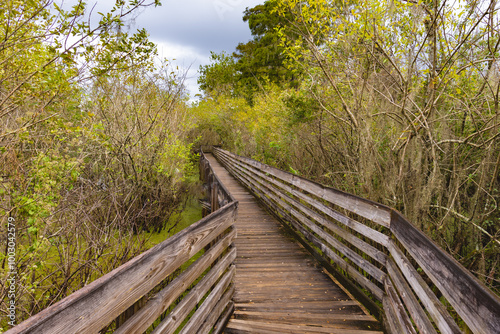 © Bo, Obraz premium The lush green trees line the path the lush green bushes trees and bushes line the boardwalk at Lettuce Lake Park Tampa Florida Hillsborough County USA