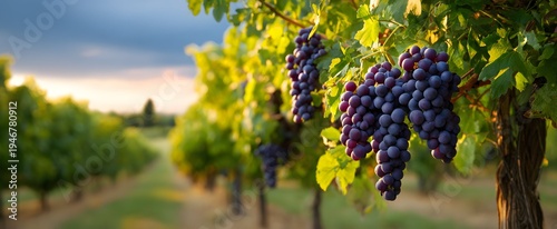 Fototapeta premium The lush vineyard glows with ripe grapes basking in the gentle afternoon sun...