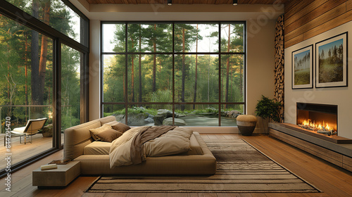 Naklejka premium The luxurious bedroom by the in a forest full of trees has a white fireplace,