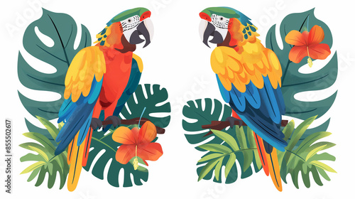 © AI-Stocks, Fototapeta premium The Macaw parrot sit with green leaves on a white background