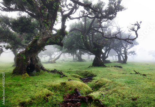 Obraz premium The magical fairy forest of Fanal, Madeira on a misty day, a tranquil...