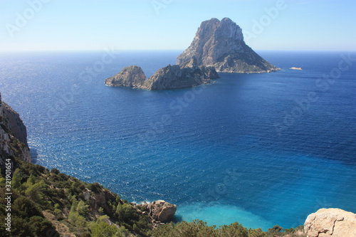 © Alessia, Fototapeta premium The magical island of Es Vedra with the small islet of Es Vedranell next to it in front of the coast of Cala d'Hort in the tourist island of Ibiza in the midst of nature between cliffs,