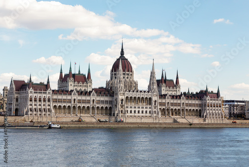 Naklejka premium The magnificent building of the Hungarian Parliament on the Danube River embankment. Summer sunny day. Budapest, Hungary.