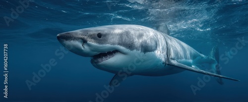 Fototapeta premium The magnificent great white shark swimming gracefully in turquoise waters.