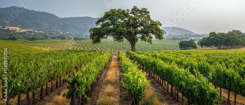 Naklejka premium The magnificent vineyard landscape with an oak tree against rolling hills.