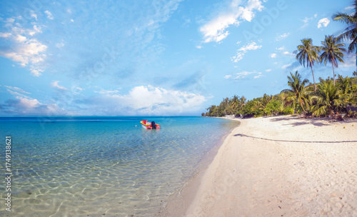 © Luis, Naklejka premium The magnificent white sand and turquoise waters of the Matira public beach on the island of Bora Bora, French Polynesia, South Pacific Ocean