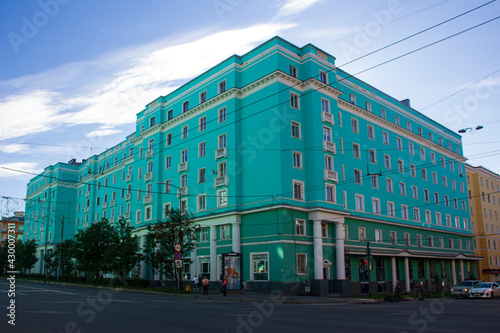 Naklejka premium The main avenue of Murmansk. Houses in the Soviet style. Russia, August 2020