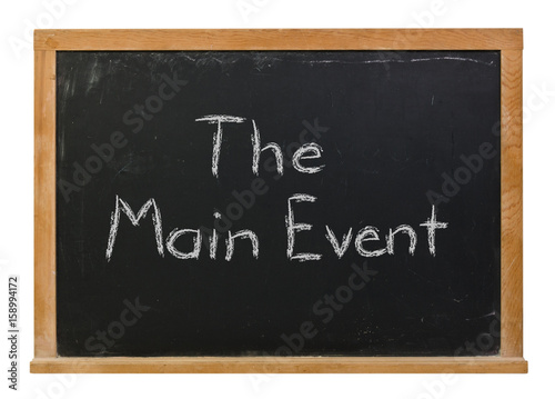 Obraz premium The Main Event written in white chalk on a black chalkboard isolated on white