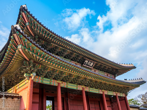 Naklejka premium The main gate at Changdeokgung Palace blue sky is a famous tourist attraction in Seoul, South Korea.