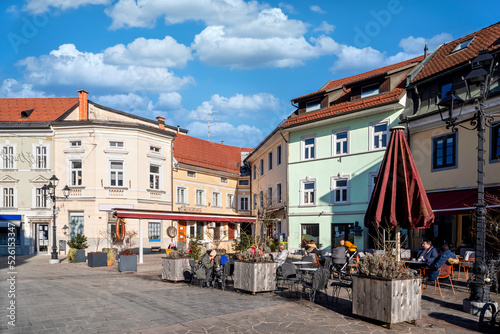 Obraz premium The main street in Kranj with people sitting in a cafe on a sunny day in...