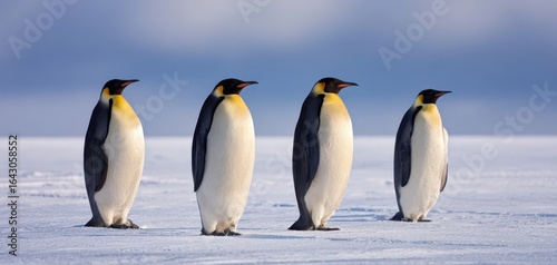 © Daryna, Fototapeta premium The majestic gathering of emperor penguins on a frozen landscape.
