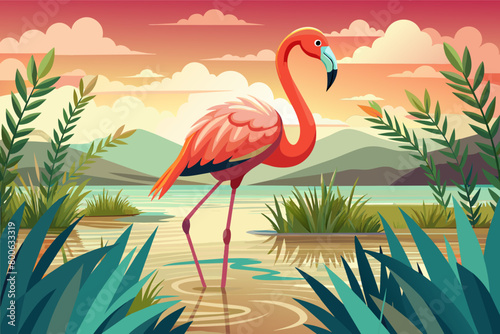 Fototapeta premium The majestic grace of a flamingo wading through a marsh