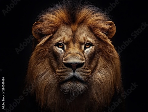 © Ardhana, Fototapeta premium The majestic lion exhibits a powerful portrait on black background