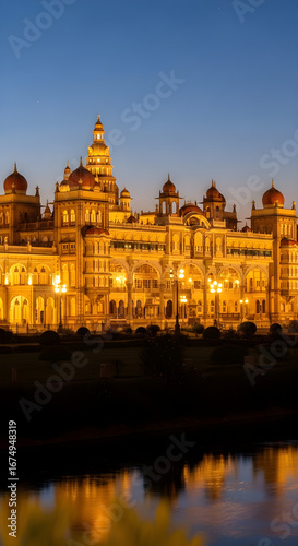 © Suntrimo, Fototapeta premium The majestic Mysore Palace illuminated with golden lights at dusk, reflecting in the calm water below.