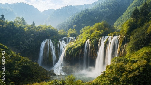 © Nuttaya Nampai, Naklejka premium The majestic Nuorilang Waterfall in Jiuzhaigou Valley, with water cascading down multiple tiers surrounded by dense forest.