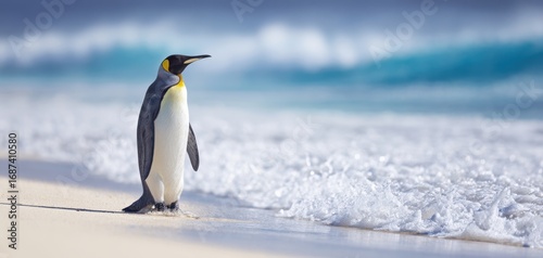 Fototapeta premium The majestic penguin standing on a serene beach with rolling waves.