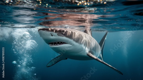© , Naklejka premium The Majestic Predator: An imposing great white shark, a symbol of the ocean's power, glides just below the surface of the water.
