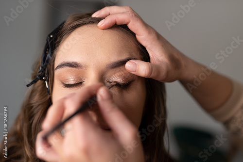 © Artsiom P, Fototapeta premium The makeup artist applies eyeliner to the girl with a brush on the upper eyelid and draws an arrow