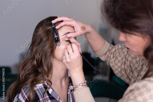 © Artsiom P, Fototapeta premium The makeup artist applies eyeliner to the girl with a brush on the upper eyelid and draws an arrow
