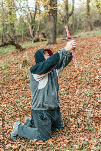 Fototapeta premium The man kneels in prayer and holds the cross up.